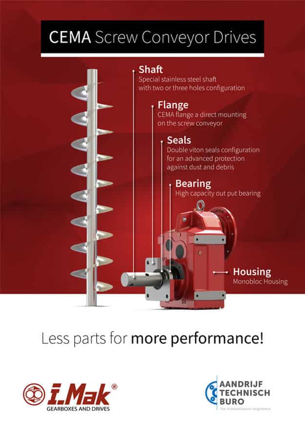 Product innovation from our partner i.Mak – Gearboxes and Drives. The YPF geared motor with monobloc housing and CEMA output, is the perfect gearbox for all kinds of screw conveyors. The special stainless steel output shaft can be configured with two or three holes and is equipped with a reinforced output bearing. The reinforced output flange and shaft meets the CEMA Standard for Screw Conveyors for easy mounting directly on the screw conveyor.